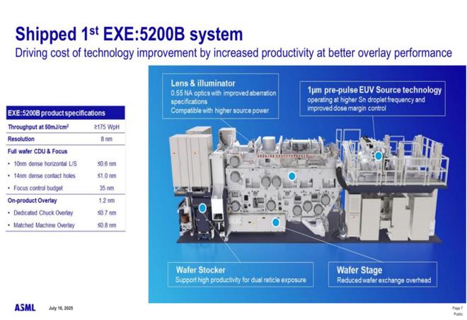 據悉,EXE:5200B系統具備多項關鍵改進,包括改進像差規格的0.55NA光學系統、在更高錫液滴頻率下運行的1µm預脈衝EUV光源技術、支持高生產力雙掩模曝光的晶圓存儲器,以及減少晶圓交換開銷。這些增強功能使系統在50mJ/cm²條件下能夠實現每小時≥175片晶圓的產能。