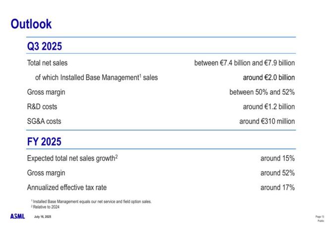 展望2025年第三季度,ASML公司預計總淨銷售額在74億至79億歐元之間,其中約20億歐元來自已安裝基礎管理。公司預計季度毛利率在50%至52%之間,研發成本約12億歐元,銷售、一般和行政費用約3.1億歐元。對於2025年全年,ASML公司維持總淨銷售額增長約15%的預期,毛利率約52%,年化有效税率約17%。