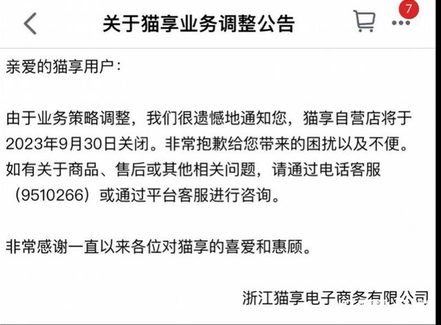但僅1年半時間,2023年8月1日,“貓享”便發佈調整公告,宣佈將於9月30日關閉。