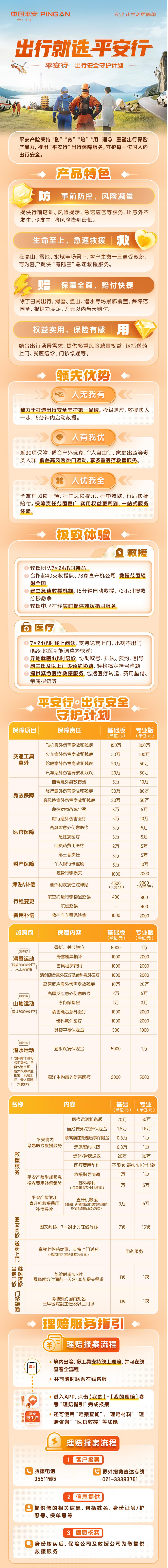 旅途的美好,需要一份安心來守護。“平安行·出行安全守護計劃”堪稱一位“財務安全閥”+ “24小時救援團隊”+“24小時的貼身管家”。它保護的不僅是錢包,更是那份在陌生環境中遭遇突發狀況時的底氣與安心。
