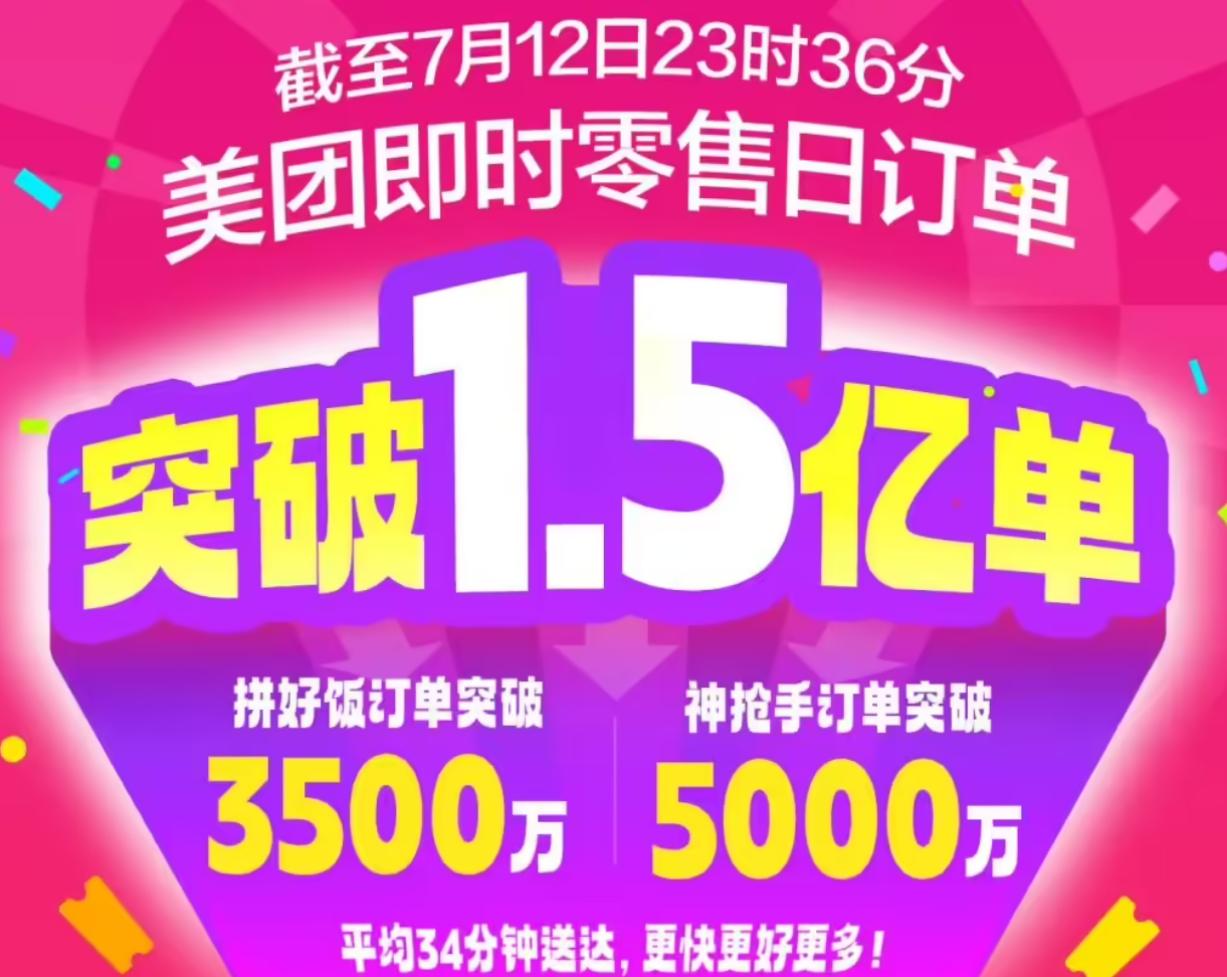 美團數據顯示,7月12日23時36分,美團即時零售日訂單量超過1.5億單。其中,拼好飯單量超過3500萬單,神搶手單量超過5000萬單,平台全量配送訂單平均送達時間為34分鐘。
