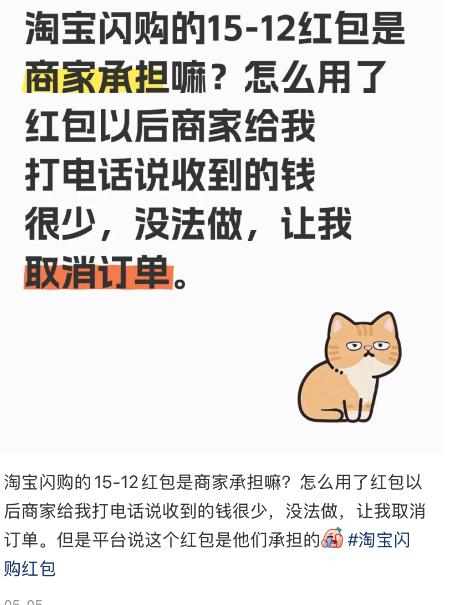 不僅如此,淘寶閃購也遇到類似問題。有網友反映自己在淘寶閃購的訂單被商家取消,認為 “優惠力度太大導致商家壓力劇增”;甚至有網友貼圖質疑:“淘寶閃購的15-12紅包是商家承擔嗎?用紅包下單後,商家直接打電話稱收到的錢太少,無法履約,要求取消訂單。”