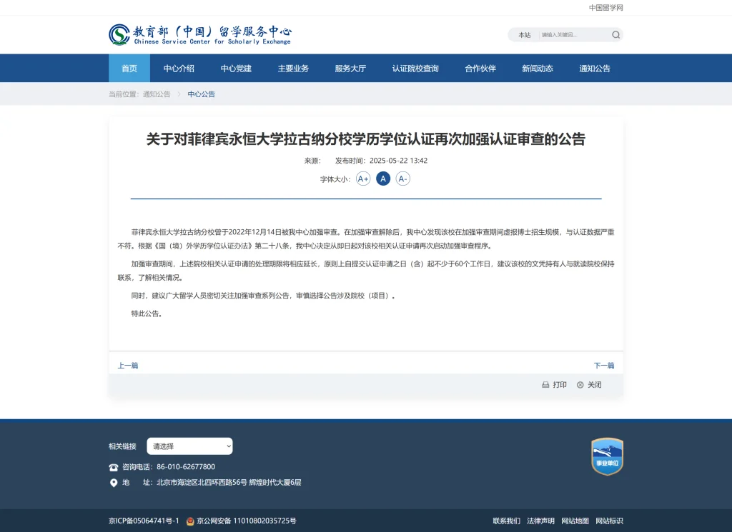 2025年5月22日,教育部留學服務中心再度在官網發文《關於對菲律賓永恒大學拉古納分校學歷學位認證再次加強認證審查的公告》:菲律賓永恒大學拉古納分校曾於2022年12月14日被我中心加強審查。在加強審查解除後,我中心發現該校在加強審查期間虛報博士招生規模,與認證數據嚴重不符。根據《國(境)外學歷學位認證辦法》第二十八條,我中心決定從即日起對該校相關認證申請再次啓動加強審查程序。