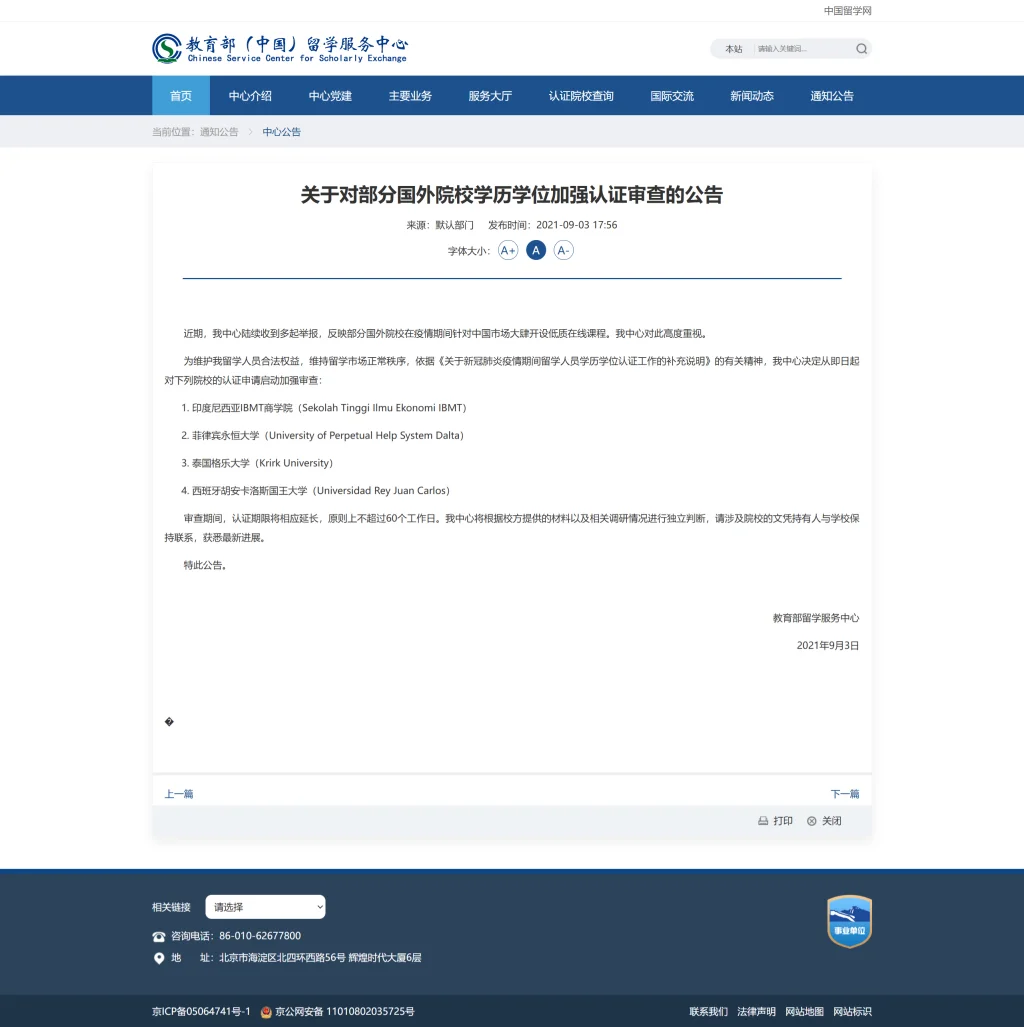 澎湃新聞記者查詢發現,教育部留學服務中心官網曾於2021年9月3日發佈《關於對部分國外院校學歷學位加強認證審查的公告》:近期,我中心陸續收到多起舉報,反映部分國外院校在疫情期間針對中國市場大肆開設低質在線課程。我中心對此高度重視。