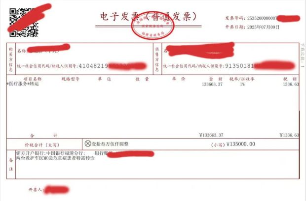 據陳靜瑜介紹,整個轉運距離約150公里,耗時3小時,費用包括使用民營救護車的ECMO設備及醫護人員勞務,不涉及置管及耗材費用,合計13.5萬元。