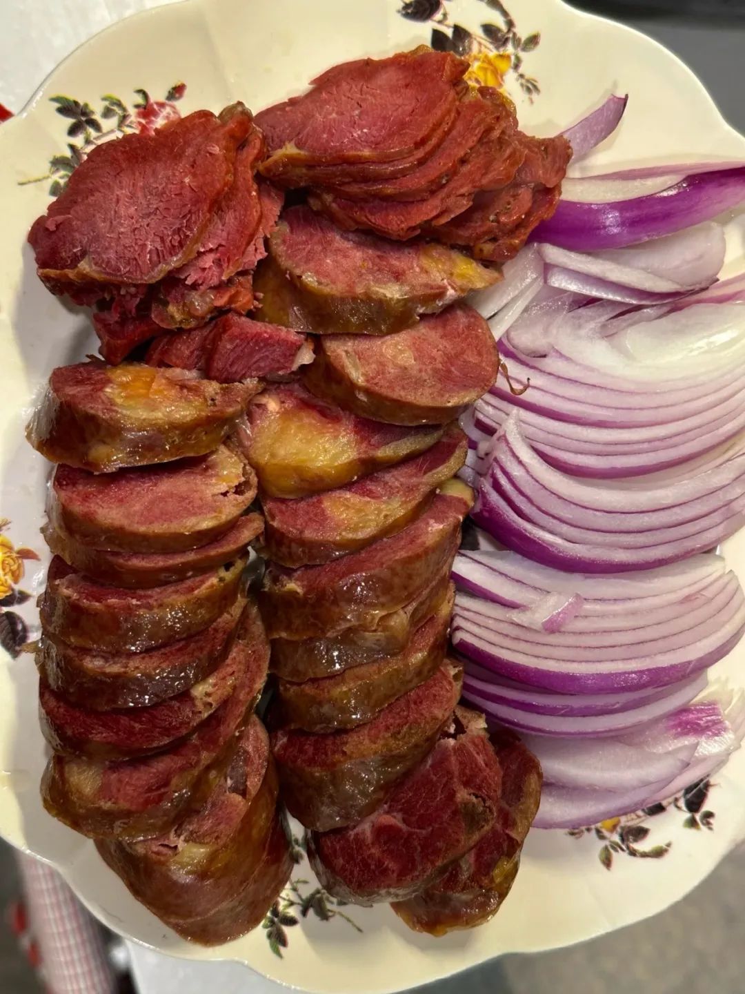 切開剛蒸熟的馬腸子,暗紅的肉色裹着琥珀般的油脂,細密紋路間滲出淡淡薰香,油光鋥亮的腸衣裹着肥瘦相間的馬肉,切片擺盤時像塊兒精緻的琥珀,不明真相的領導多半會先誇一句“看着就有食慾”。