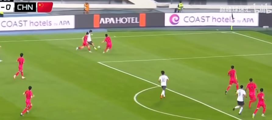 王鈺棟在左邊接球,圖中看出,當時才剛過了半場,對方邊衞就緊緊把王鈺棟纏住,不讓他加速,白衣的中國球員也每個人都有韓國球員在盯防,