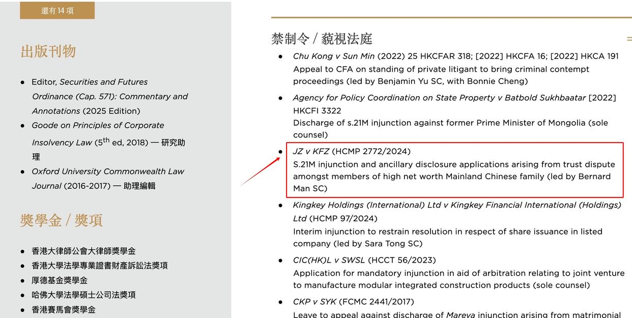《每日經濟新聞》記者查詢獲悉,香港一家律所的律師在官網展示了其代理上述案件的信息,他如是表述這宗案件:“因中國內地高淨值家庭成員之間的信託糾紛,而產生的禁令及附帶披露申請。”其案件編號與記者從香港高等法院獲取的案件編號一致。