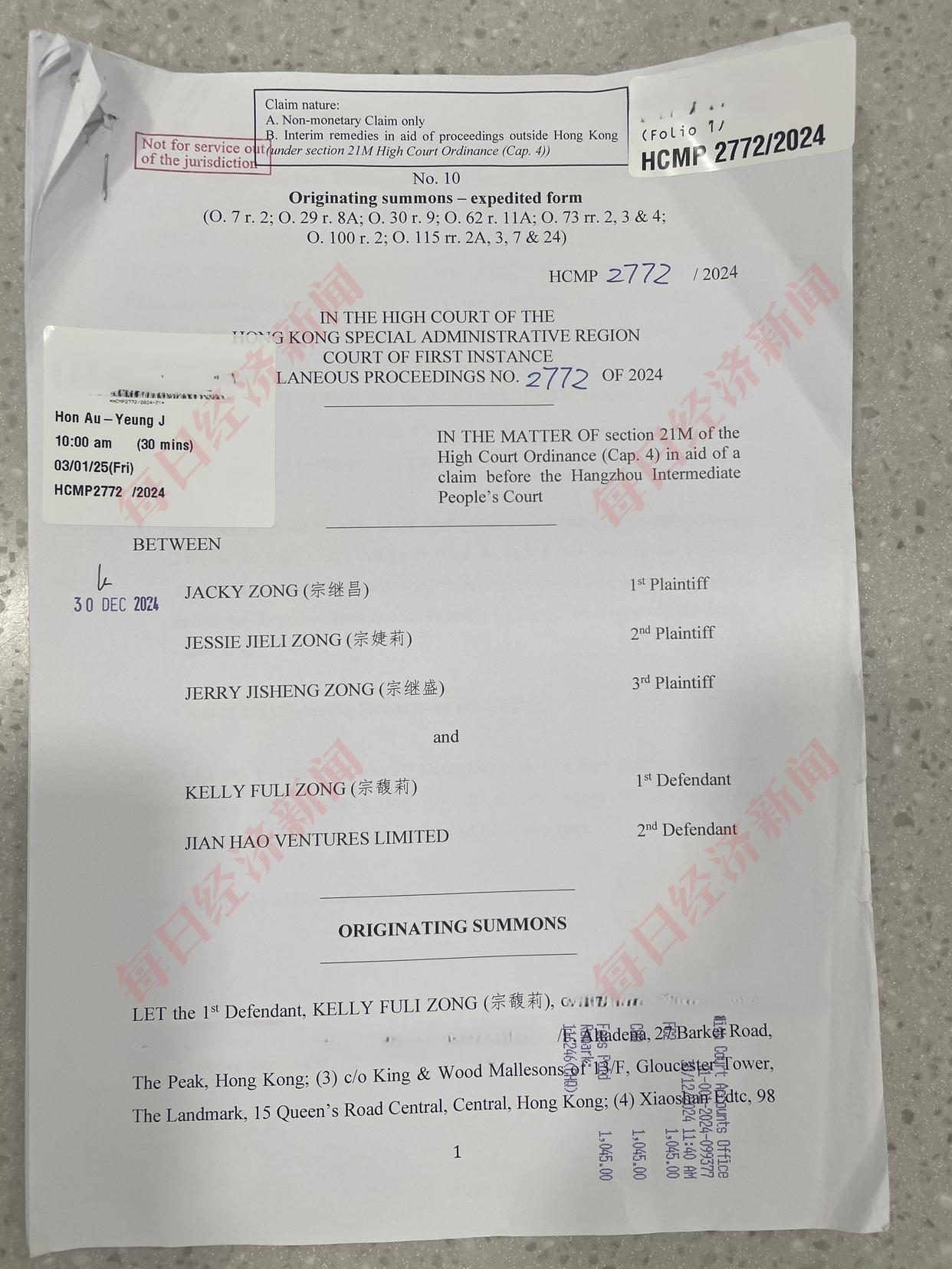 原告方宗繼昌等三人的起訴狀原件圖片來源:記者從香港高院獲取該法律文書顯示,案件原告方三人分別為Jacky Zong(宗繼昌)、Jessie Jiele Zong(宗婕莉)、Jerry Jisheng Zong(宗繼盛),被告方為Kelly Fuli Zong(宗馥莉)(第一被告人)和Jian Hao Ventures Limited(第二被告人,一家在英屬維京羣島註冊的公司)。