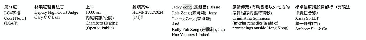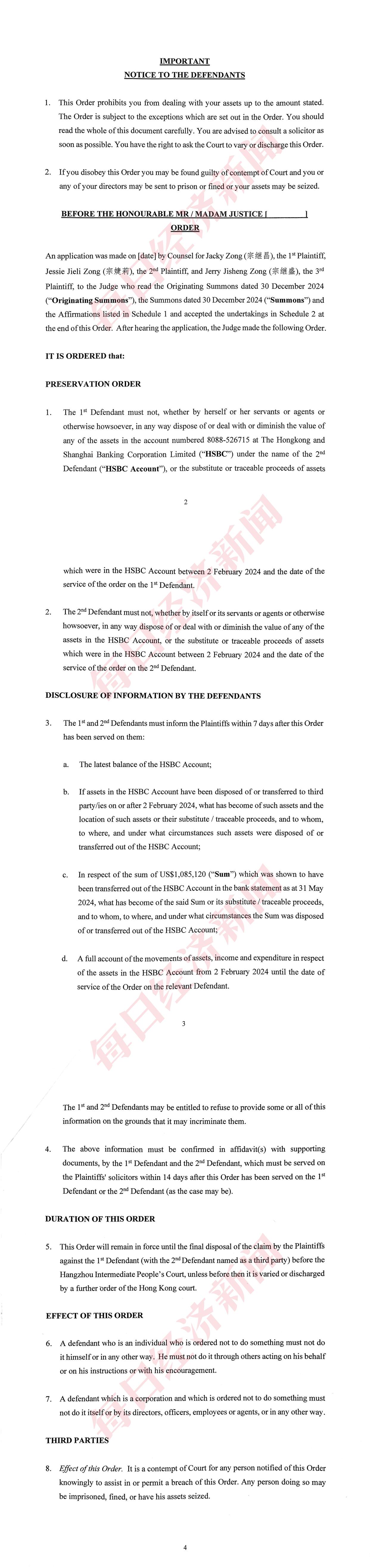 該文書顯示,2024年12月,宗繼昌、宗婕莉、宗繼盛三人向香港高院申請針對宗馥莉的臨時禁令,以阻止她處置、處理或減少在滙豐銀行以建昊企業有限公司名義開立賬户的資產價值。法院在審閲原訴傳票(注:originating summons,香港民事訴訟的一種啓動方式)、原告方及律師確認書、原告承諾書等證據資料後,向兩名被告發出了臨時禁止令。