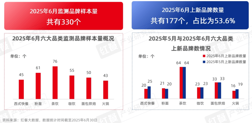 為洞悉餐飲行業產品上新發展趨勢,紅餐產業研究院選取了餐飲行業具有代表性的六個品類作為監測對象,包括西式快餐、粉面、茶飲、咖飲、麪包烘焙、火鍋這六大品類。在2025年6月,紅餐產業研究院監測的六大品類的品牌樣本量一共有330個,總計有177個品牌推出新品,佔監測品牌樣本量的53.6%。