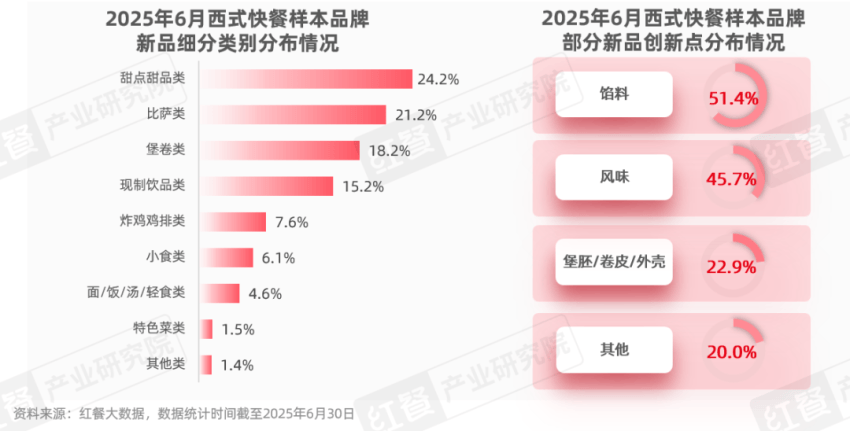 2025年6月,紅餐產業研究院監測的西式快餐品牌中有20個品牌共推出了66款新品。從新品的細分類別來看,當月新品涵蓋的類別有甜點甜品類、比薩類、堡卷類、現制飲品類等9種。