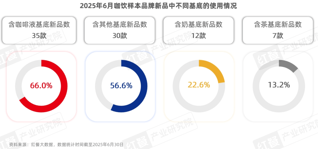 此外,從茶飲類和咖啡類新品使用的基底來看,咖飲樣本品牌推出的新品中,咖啡液基底是佔比最高的基底,含咖啡液基底的新品佔總數的66%;含其他基底的新品有30款,佔比為56.6%,與5月相比,佔比大幅提升;而奶基底和茶基底的應用有所減少,新品數佔比分別為22.6%、13.2%。