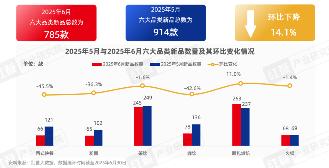 為洞悉餐飲行業產品上新發展趨勢,紅餐產業研究院對六大餐飲品類的品牌在2025年6月的上新情況做了監測,並整理發佈了《餐飲行業產品上新報告(2025年6月)》。