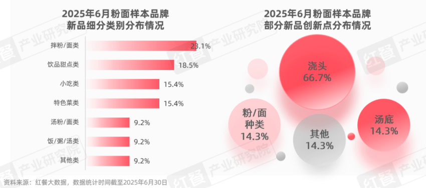 2025年6月,在紅餐產業研究院監測的61個粉面品牌中,有21個品牌共推出了65款新品,當月粉面新品涵蓋的類別有拌粉/面類、飲品甜點類、小吃類、特色菜類、湯粉/面類和飯/粥/湯類。