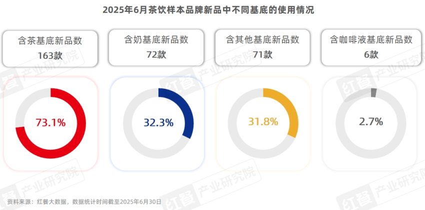 從茶飲類和咖啡類新品使用的基底來看,茶飲樣本品牌推出的新品中,含茶基底的新品數有163款,佔比為73.1%,相較5月,數量有所下降,佔比則提升了4.5個百分點;所有新品中,有72款新品含有奶基底,佔所有總數的32.3%,相較於5月,數量和佔比均有所下降;所有新品中有71款新品使用了其他基底,佔比達31.8%,與5月相比,數量和佔比均有小幅增長。