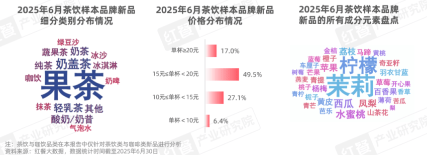從價格分佈來看,6月茶飲新品價格主要集中在15元≤單杯<20元和10元≤單杯<15元兩個區間內,佔比分別為49.5%和27.1%,而10元以下和20元及以上區間的新品則相對較少,佔比分別為6.4%和17%。