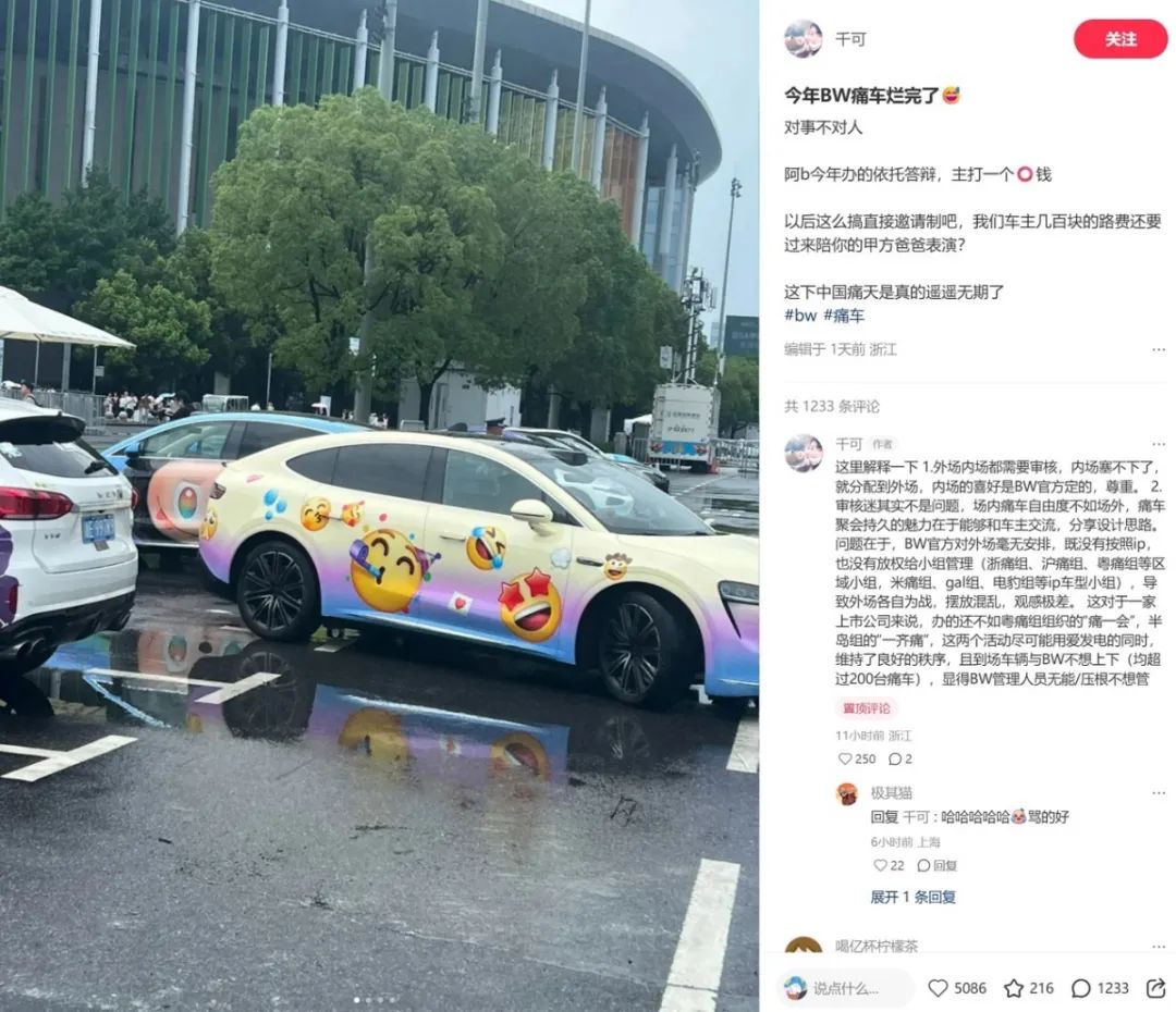 一個典型的例子是這屆BW同樣號稱“亞洲最大痛車聚會”,原本組織有超過800輛痛車彙集,由於安排管理不善,許多車主認為自己只是被找來給甲方參展商以及關係户湊數的,也在社交平台上鬧出了一些“避雷”貼。