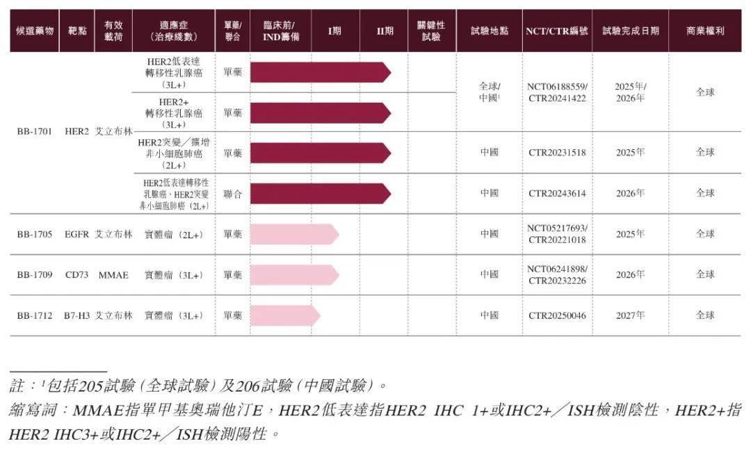 截至遞表前,公司已打造出由四款臨牀階段候選藥物組成的ADC管線,其中核心產品BB-1701是一種靶向HER2(人類表皮生長因子受體2)、以艾立布林為有效載荷的ADC候選藥物,主要面向乳腺癌、非小細胞肺癌及其他潛在HER2表達癌症適應症展開研發,現已進入II期臨牀。