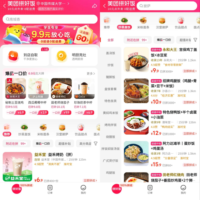 拼好飯頁面核心品類主要覆蓋炒菜、蓋飯、米粉面條等正餐品類,更能滿足消費者一日三餐需求。
