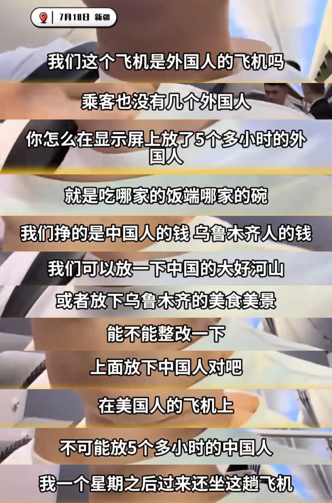 這事在網上被迅速傳播開,有人認同旅客的表達,也有人覺得這是“過度敏感”“上綱上線”。可據當班其他旅客跟我留言,説這個航班一共飛4個多小時,前三個小時放的就是祖國的大好河山啊!我專門去找乘務員問了一下,7月份固定播放的內容叫做《空中博覽7月份回程》,是航司傳媒自己拍的(所以這旅客是不是想起號啊)。但我不打算談情緒、談立場——我更在意的是一個現實問題: