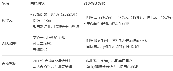 在AI大模型領域,百度文心一言雖用户增長快(DAU百萬級) ,但商業化滯後(付費率不足5%),開源策略反應遲緩,技術優勢未轉化為市場競爭力。此外,百度在自動駕駛領域的佈局雖早(2017年推出Apollo計劃) ,但與吉利合資造車進展緩慢,短期內難以成為增長支柱。
