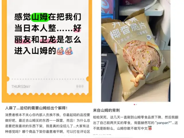 甚至有小紅書用户,在好麗友之外,還開闢出了“徐福記”“盼盼”“衞龍”上架山姆的“第二戰場”,並就這些品牌該不該上架山姆,吵得不可開交。比如,有在山姆買到“panpan(盼盼)”食品的消費者稱遭到了“來自山姆的背刺”。
