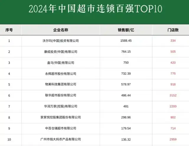 在2024年中國超市連鎖百強TOP10排名中,沃爾瑪憑藉着1588餘億元的銷售額位列榜首,同時,據媒體報道,這一年山姆的銷售額或已突破1000億元,但相較沃爾瑪穩居榜首的“不變”,這一年榜單最大的變化在於,盒馬憑藉750億元的銷售額首次闖進全國超市排名前三,進一步拉近了與山姆的身位差距。