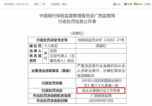 2020 年 8 月,原廣西銀保監局針對該案涉及的內控問題,已對工行南寧分行作出行政處罰決定,罰款 150 萬;同時對梁建紅作出終身禁業決定,認定其 “利用職務便利實施犯罪,嚴重損害金融消費者權益”。