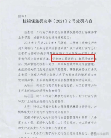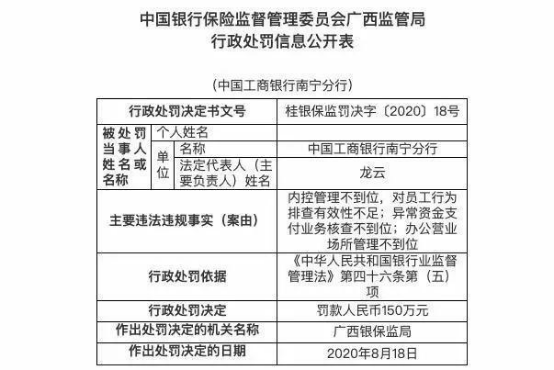 關於工行南寧分行內控機制,監管部門此前的罰單早已揭示出其重大缺陷。