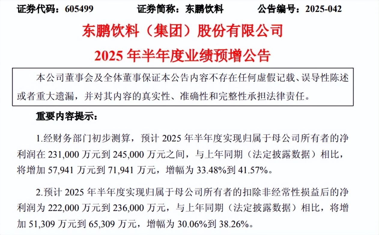 赴港上市工作推進4個月之際,東鵬飲料先交出一份半年度預報,整體高增長勢能依舊充足,公司預計上半年營收再創同期歷史新高,同比增35.0%~37.7%至106.3-108.4億元;歸母淨利潤同步預計增33.5%~41.6%、扣非歸母淨利潤也預計同比增30.1%~38.3%。