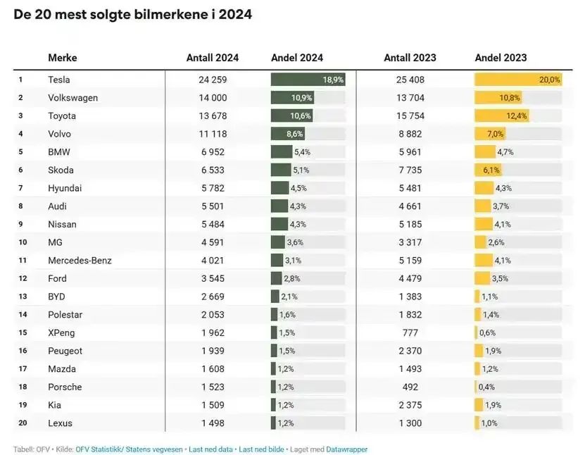 挪威2024年暢銷車型