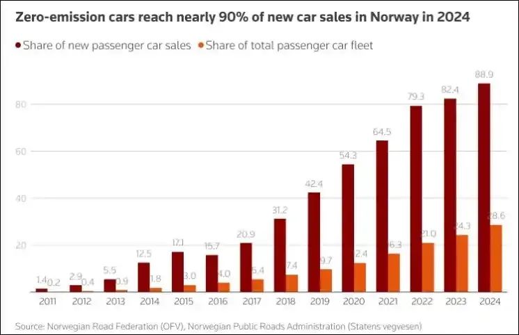 挪威公路聯合會今年1月發佈的數據顯示,2024年挪威銷售新車中電動汽車佔比達88.9%。