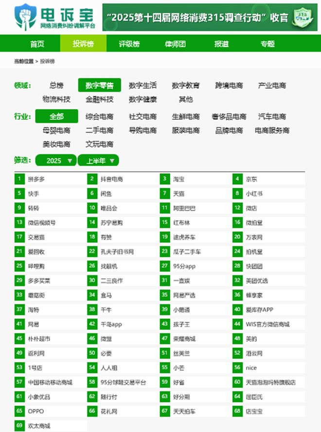 投訴量TOP10依次為:拼多多、抖音電商、淘寶、京東、快手、閒魚、天貓、小紅書、轉轉、唯品會;