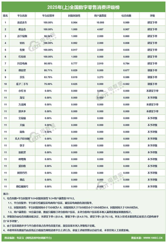 在2025年(上)全國數字零售評級榜中:獲**“建議下單”的有:途虎養車、唯品會、蘇寧易購、轉轉、有贊、紅布林、抖音電商共7家;獲“謹慎下單”評級的有:微拍堂等3家;獲“不建議下單”的有:小紅書等3家;獲“不予評級”的有:淘寶、天貓、閒魚、快手、阿里巴巴、微店等12**家。