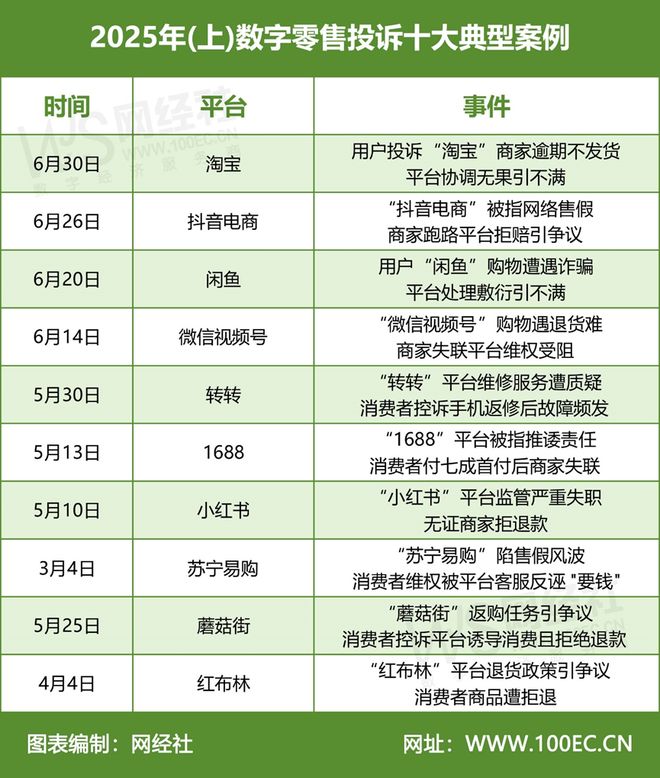 此外,入選《2025年(上)數字零售典型投訴案例》的有:淘寶、抖音電商、閒魚、微信視頻號、轉轉、1688、小紅書、蘇寧易購、蘑菇街、紅布林。