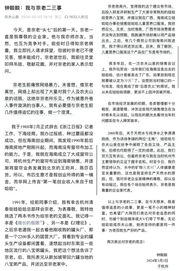 宗慶後“頭七”當天,鍾睒睒以千字長文《我與宗老二三事》回應網上的不實傳聞。