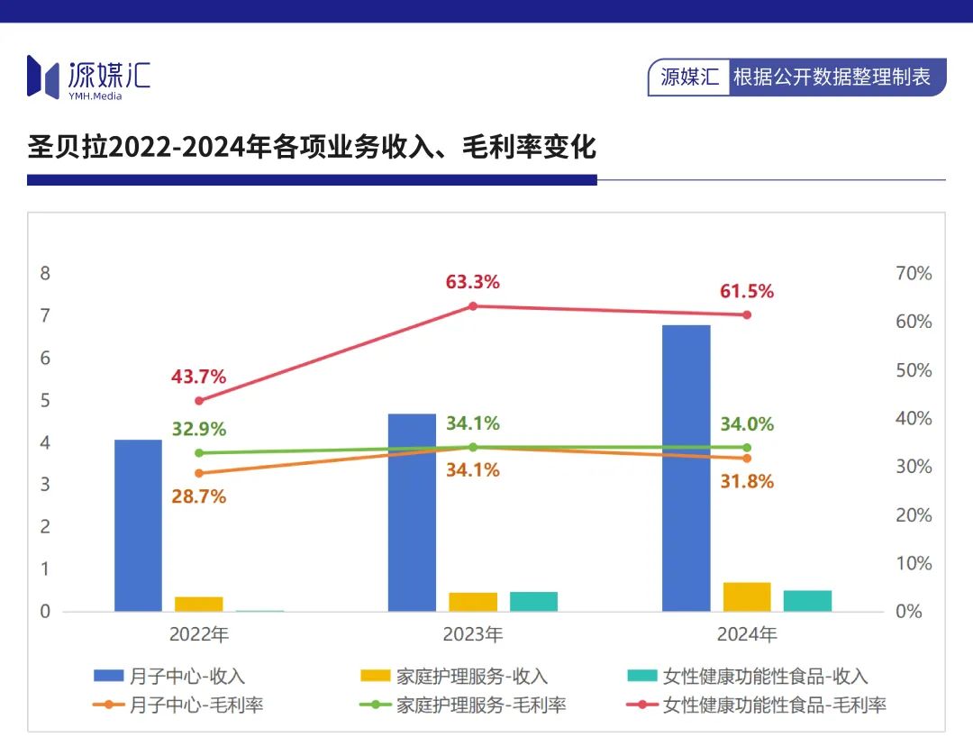 聖貝拉的收入,主要來源於月子中心和家庭護理服務。2022-2024年,月子中心收入為4.1億元、4.68億元和6.8億元,家庭護理服務為0.35億元、0.45億元和0.7億元,兩項業務毛利率在30%左右。