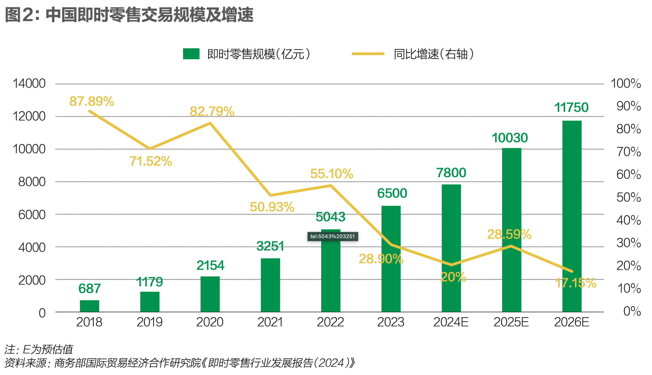 近年來,隨着供應鏈逐步完善、消費習慣逐漸養成,即時零售已成為互聯網巨頭的兵家必爭之地。據商務部國際貿易經濟合作研究院發佈的數據顯示,2023年中國即時零售市場規模達到6500億元,同比增長28.9%。預計2030年,這一數字將突破2萬億元,成為拉動消費的關鍵引擎之一。