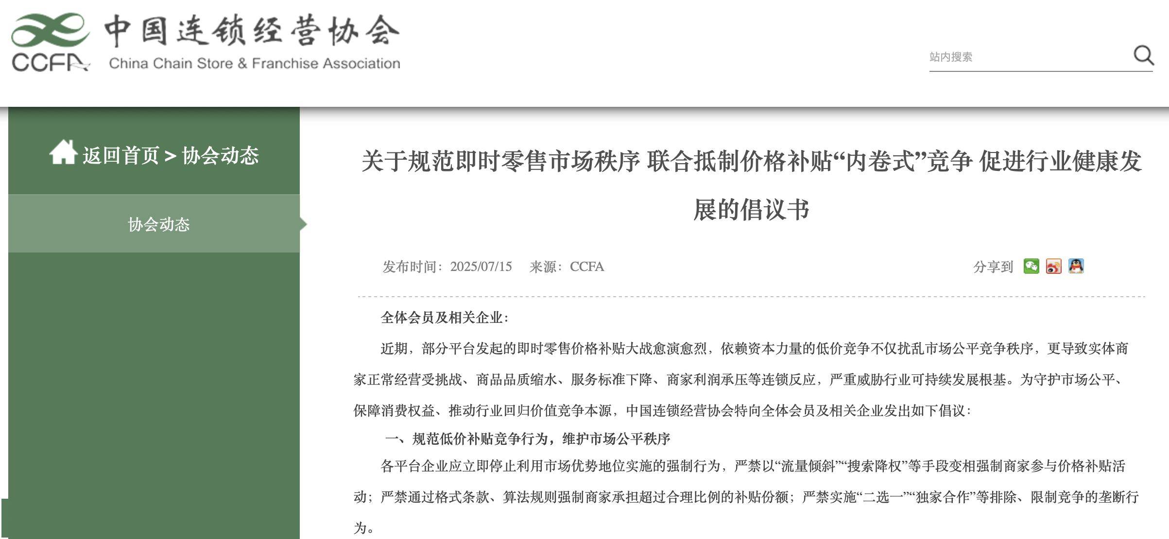 2025年7月15日,貴州省遵義市紅花崗區餐飲行業商會發布的《呼籲外賣平台停止"內卷式"補貼和不正當競爭倡議書》顯示,美團、淘寶閃購(餓了麼)近期發起的“0元購”“滿18減18”等極端補貼行為,為爭奪外賣市場份額挑動低於成本價的惡性價格戰,已造成市場經營秩序混亂、行業生態嚴重失衡。