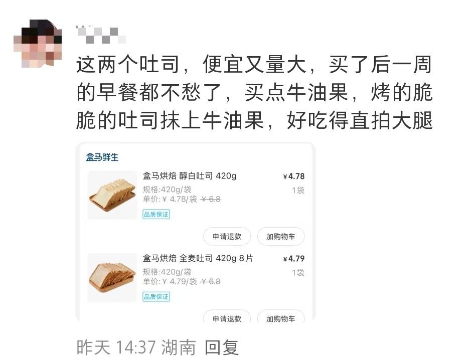 對於追求實惠的打工人來説,盒馬烘焙的吐司麪包才是最愛,不僅量大而且便宜,買了後一週的早餐都不愁了,“烤的脆脆的吐司抹上牛油果,好吃得直拍大腿”。