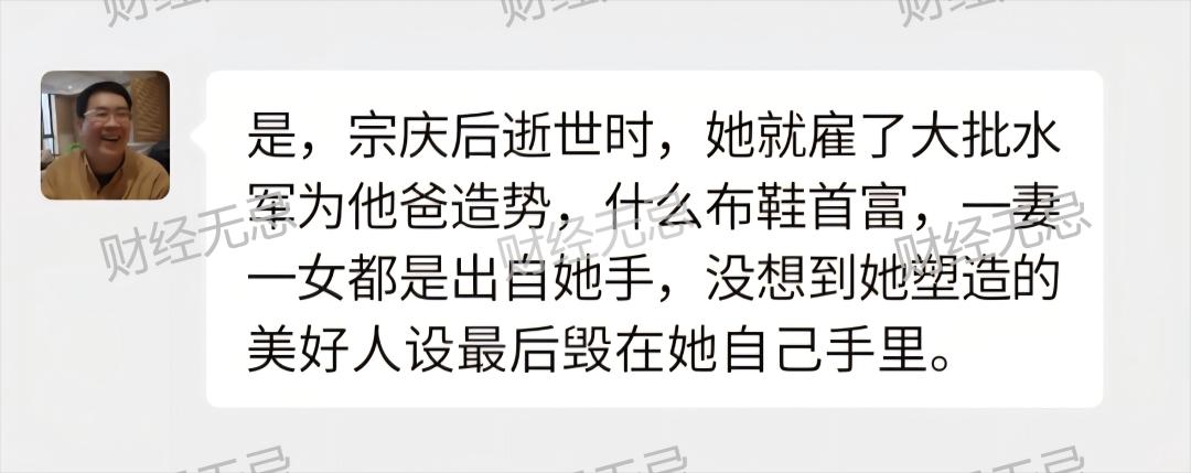 “宗慶後逝世時,她就僱了大批水軍為他爸造勢,什麼布鞋首富,一妻一女都是出自她手,沒想到她塑造的美好人設最後毀在她自己手裏。”