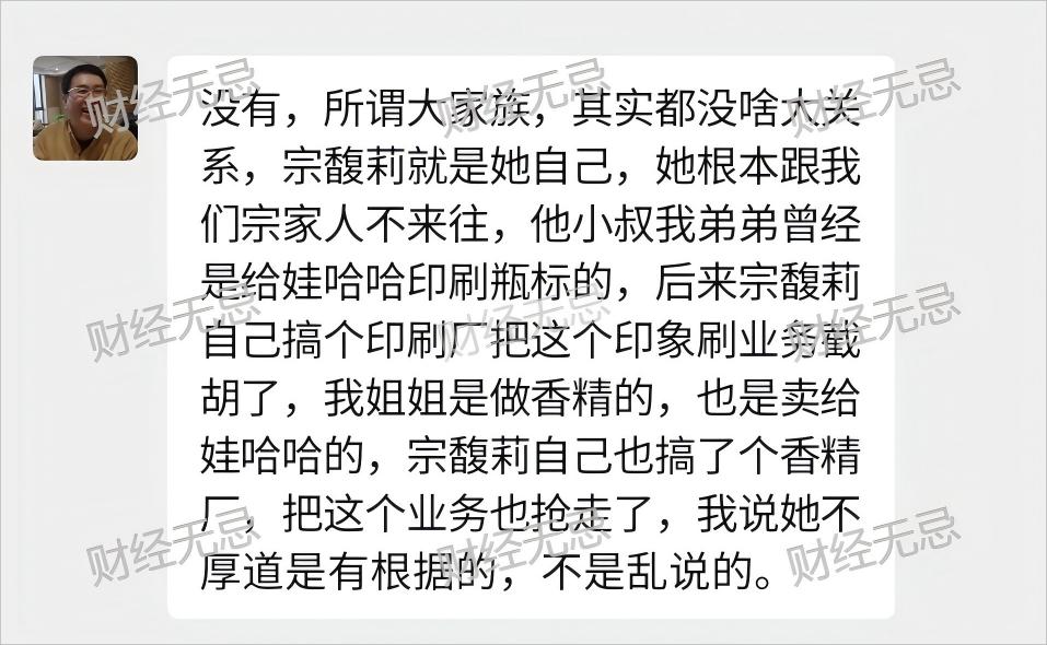 所謂大家族,其實都沒啥大關係,宗馥莉就是她自己,她根本跟我們宗家人不來往,他小叔我弟弟曾經是給娃哈哈印刷瓶標的,後來宗馥莉自己搞個印刷廠把這個印象刷業務截胡了,我姐姐是做香精的,也是賣給娃哈哈的,宗馥莉自己也搞了個香精廠,把這個業務也搶走了,我説她不厚道是有根據的,不是亂説的。