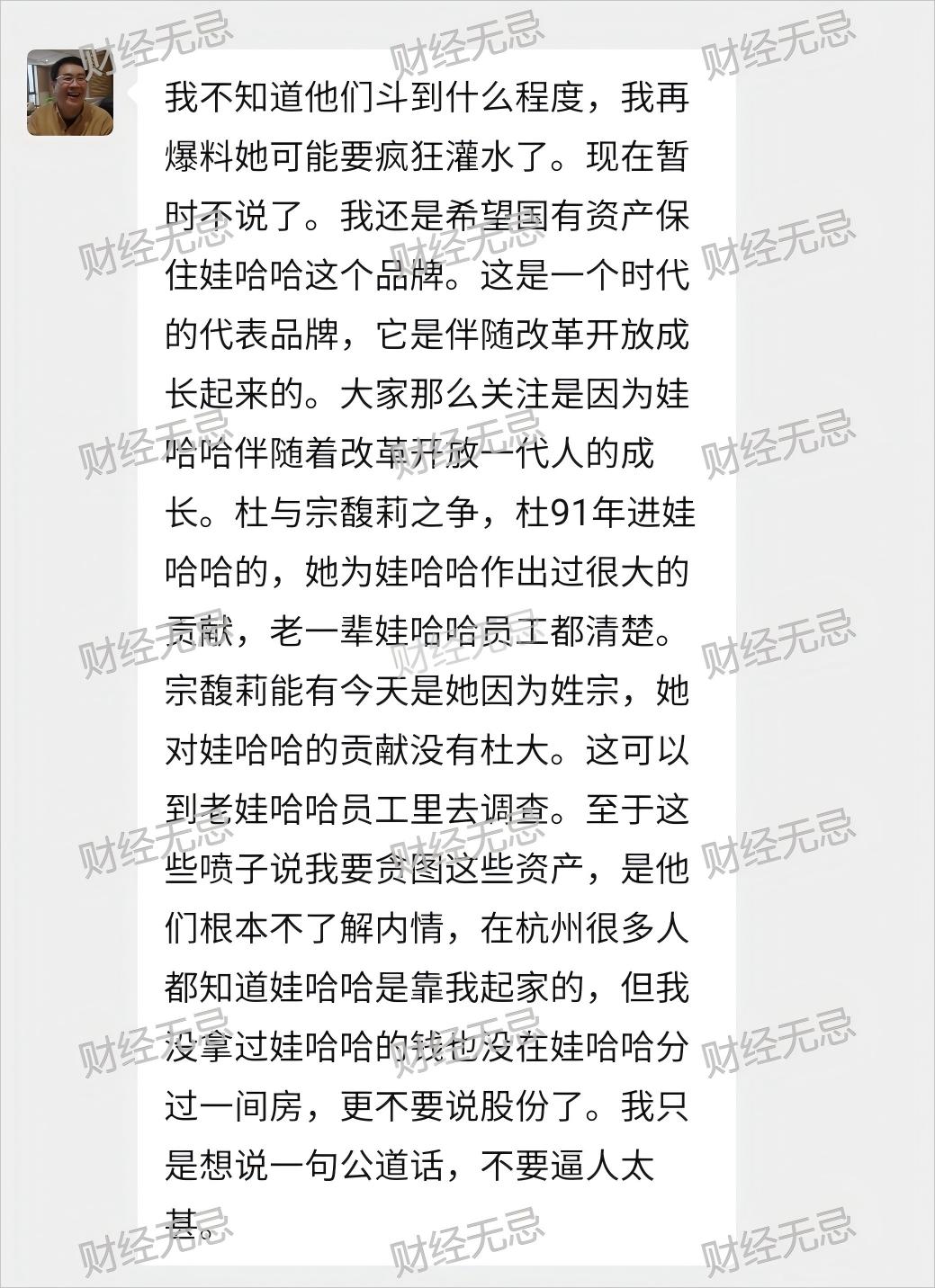 我不知道他們鬥到什麼程度,我再爆料她可能要瘋狂灌水了。現在暫時不説了。我還是希望國有資產保住娃哈哈這個品牌。這是一個時代的代表品牌,它是伴隨改革開放成長起來的。大家那麼關注是因為娃哈哈伴隨着改革開放一代人的成長。杜與宗馥莉之爭,杜91年進娃哈哈的,她為娃哈哈作出過很大的貢獻,老一輩娃哈哈員工都清楚。宗馥莉能有今天是她因為姓宗,她對娃哈哈的貢獻沒有杜大。這可以到老娃哈哈員工裏去調查。至於這些噴子説我要貪圖這些資產,是他們根本不瞭解內情,在杭州很多人都知道娃哈哈是靠我起家的,但我沒拿過娃哈哈的錢也沒在娃哈哈分過一間房,更不要説股份了。我只是想説一句公道話,不要逼人太甚。