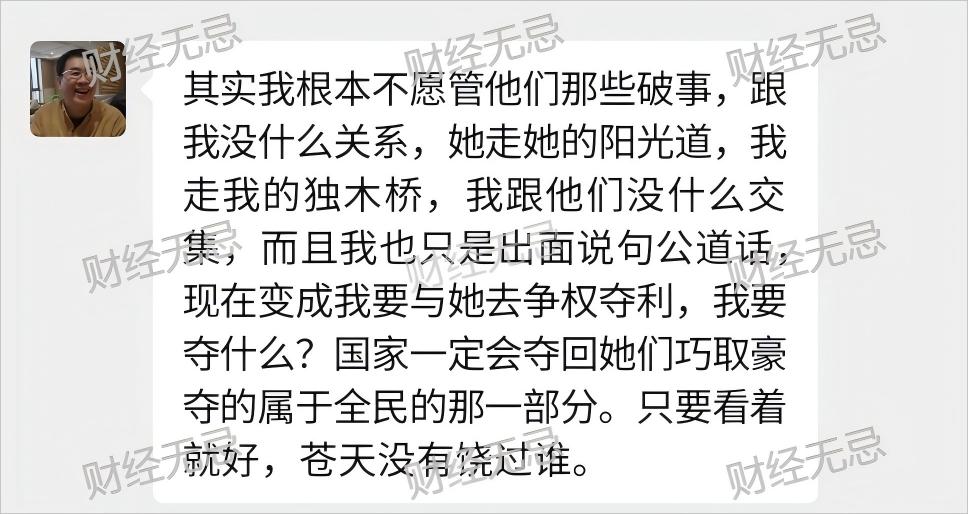 其實我根本不願管他們那些破事,跟我沒什麼關係,她走她的陽光道,我走我的獨木橋,我跟他們沒什麼交集,而且我也只是出面説句公道話,現在變成我要與她去爭權奪利,我要奪什麼?國家一定會奪回她們巧取豪奪的屬於全民的那一部分。只要看着就好,蒼天沒有饒過誰。