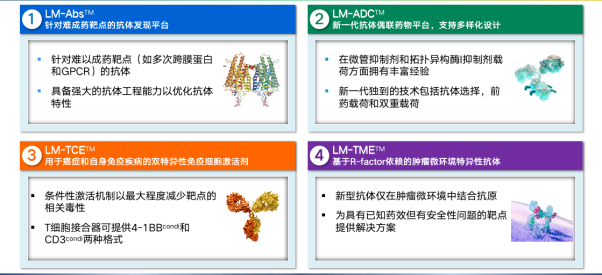 如下圖所示,目前其打造了4大技術平台,契合藥物的研發趨勢。例如,LM-ADCTM作為新一代ADC平台,在靶點、抗體、毒素和連接子等要素層面都有創新之處,屬於能夠多樣化設計多樣化的連接子和載荷工具箱。基於此,在開發雙載荷ADC等藥物層面,就有顯著的優勢。