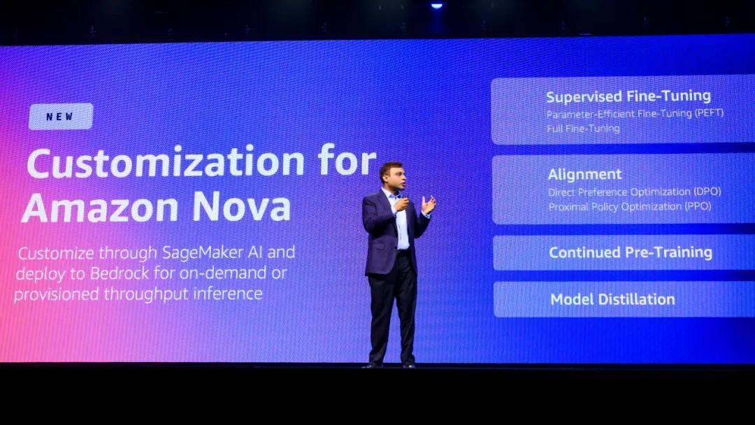 首先是Amazon Nova大模型的升級,提供了監督微調、對齊、持續預訓練、知識蒸餾等自定義技術,客户可以在整個模型訓練生命週期中自定義Nova Micro、Nova Lite和Nova Pro等模型,不斷提升準確性。