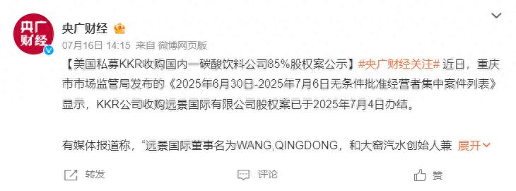 重慶市市場監管局發佈的《2025年6月30日-2025年7月6日無條件批准經營者集中案件列表》顯示,KKR收購遠景國際股權案已於2025年7月4日辦結。