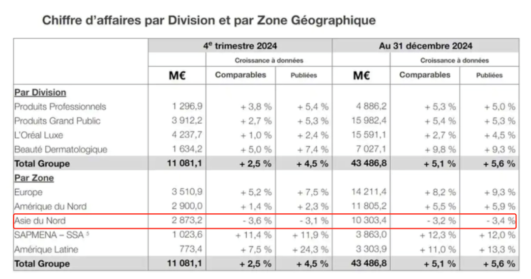 歐萊雅在2024年收穫了銷售額和營業利潤的中個位數增長,但以中國為代表的北亞市場還是下滑了3.2%。
