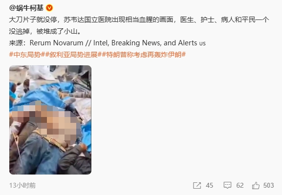 16號整整一天時間,電報羣組裏到處都是朱拉尼部隊開屠德魯茲人的小視頻,幾十個不帶重樣的。到了晚上(敍利亞時間下午),朱拉尼部隊終於拉了個大的——據報,朱拉尼部隊在蘇韋達國立醫院,屠殺了所有醫生、護士、患者、陪護平民,殺的屍橫遍地血肉橫飛,充分展現出了朱拉尼部隊教權派恐怖分子的“風采”。